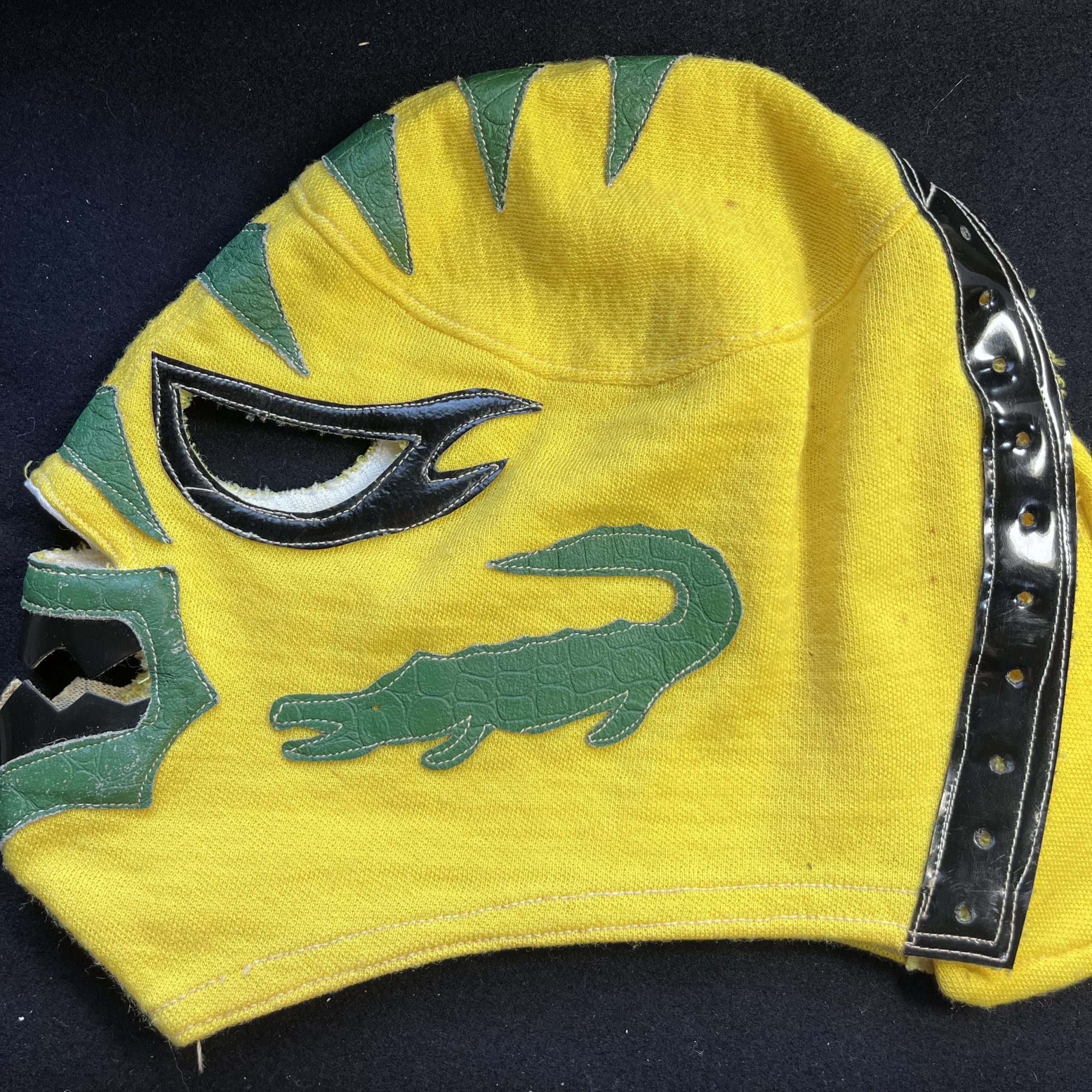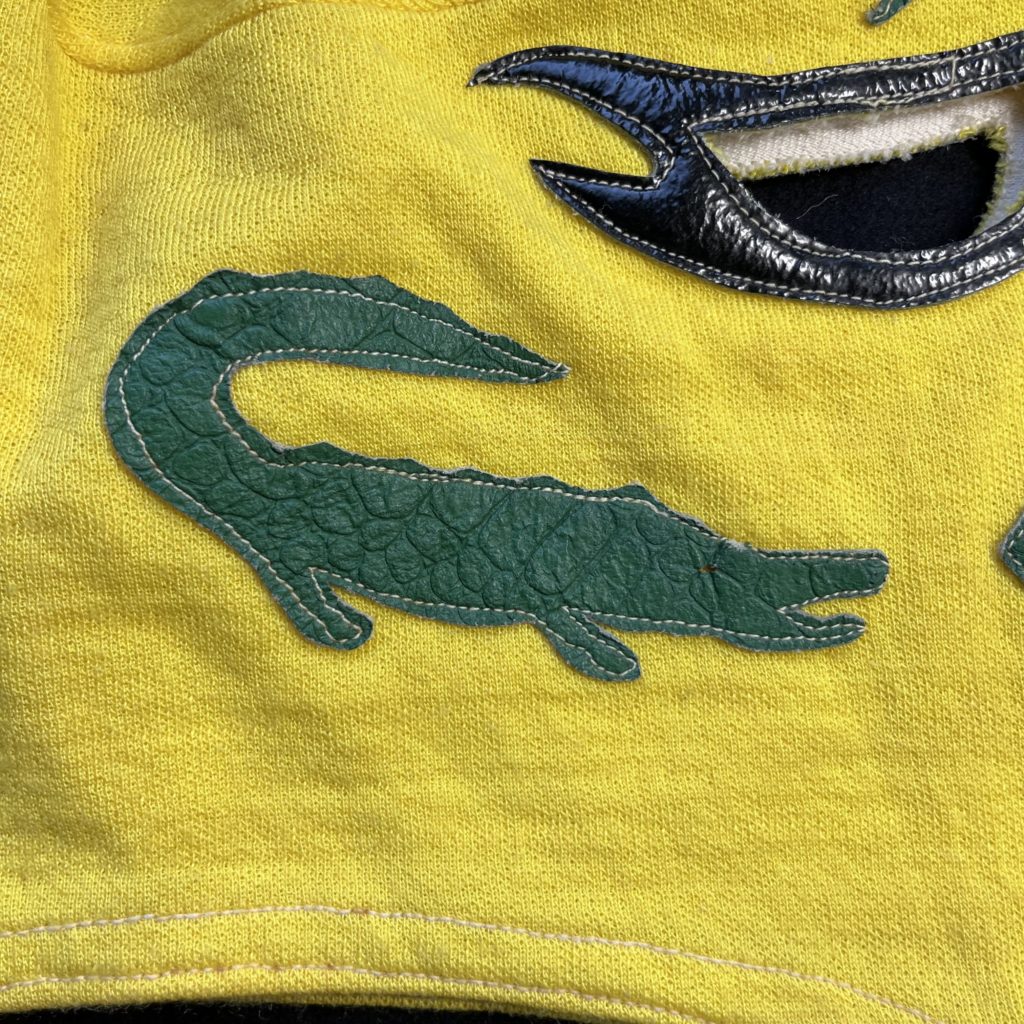 黄色の厚手のジャージにワニの模様が付いています。