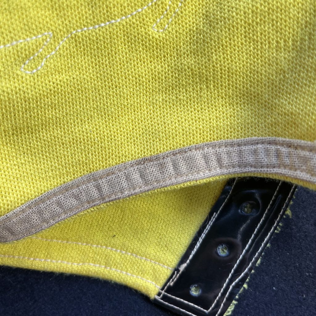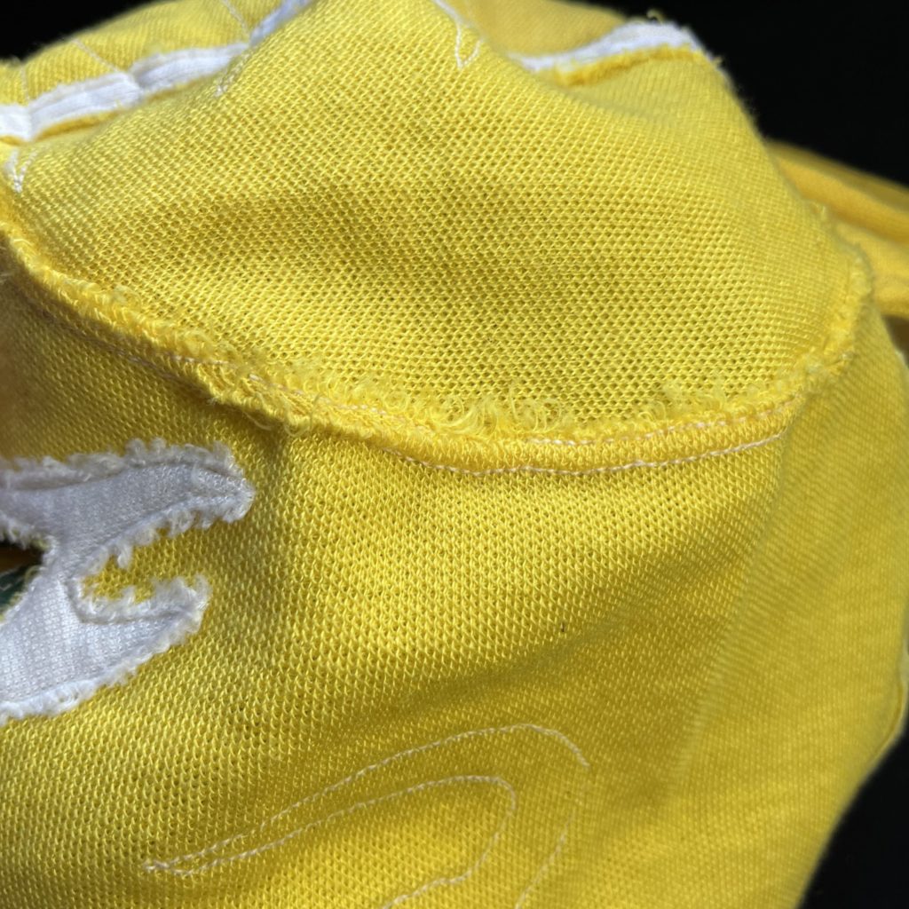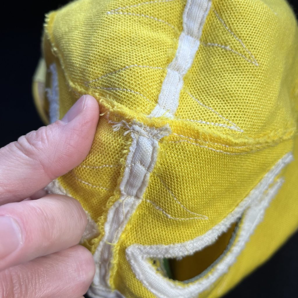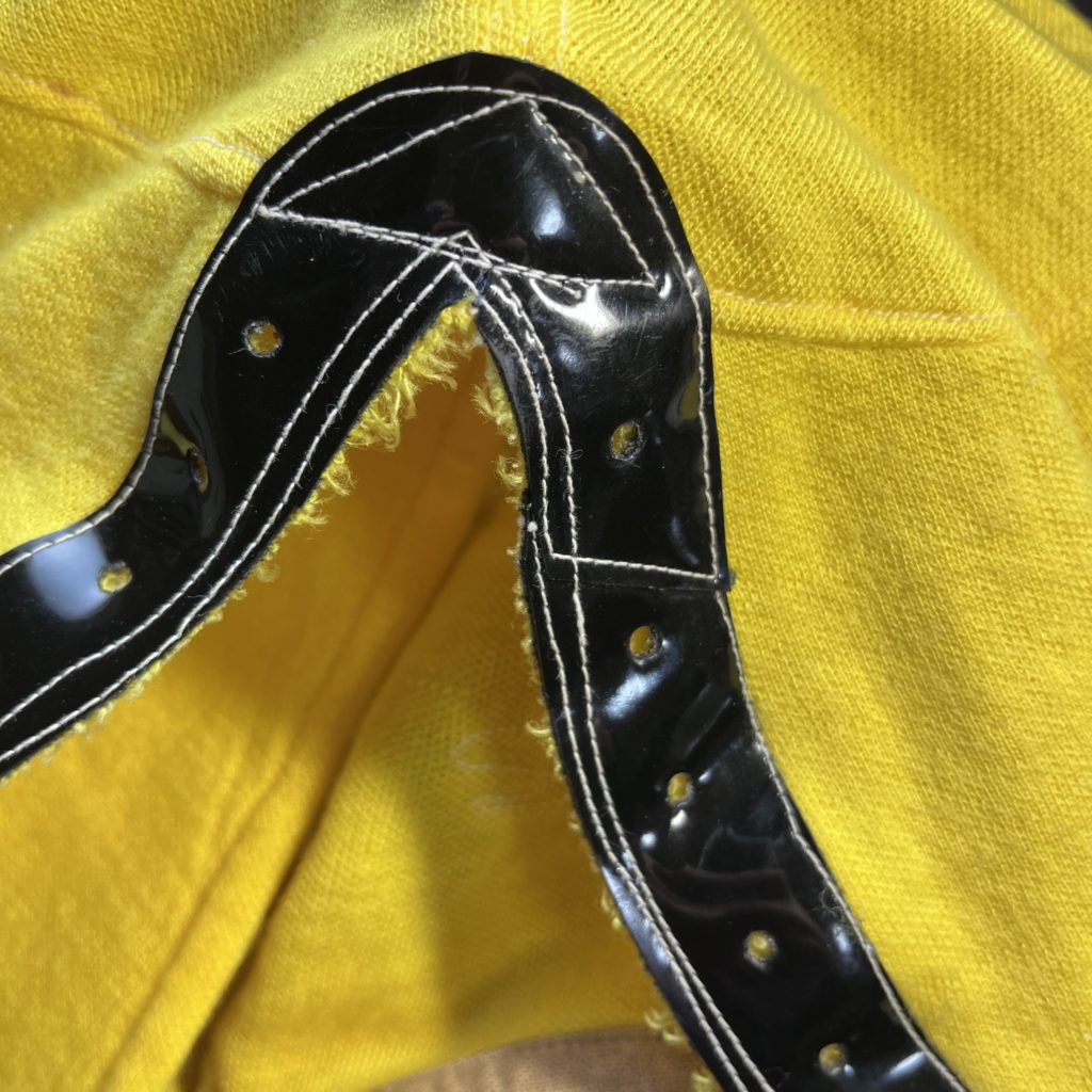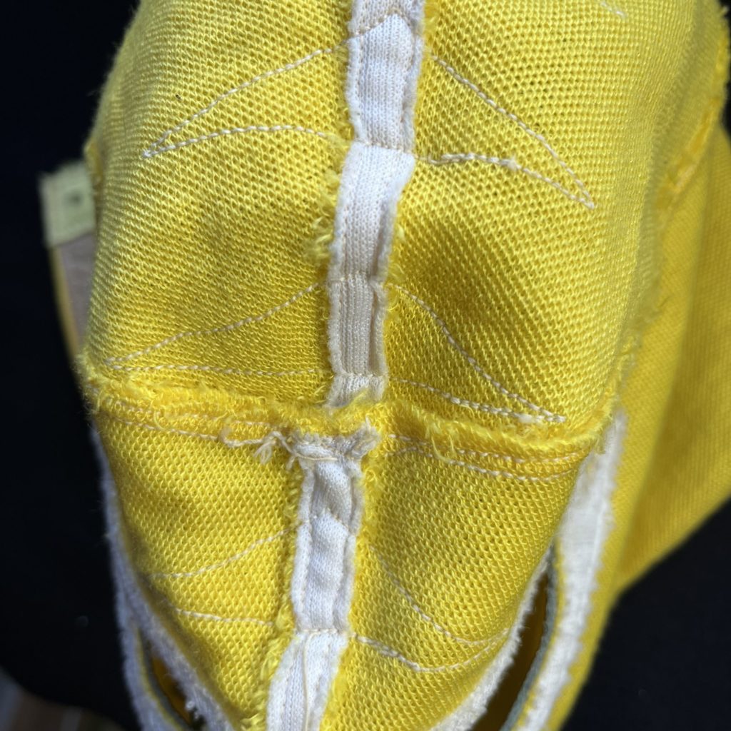 切れていますね。テープでは無くて、ジャージ生地の切りっぱなしでテープ代わりにしています。これもブシオではありましたね。